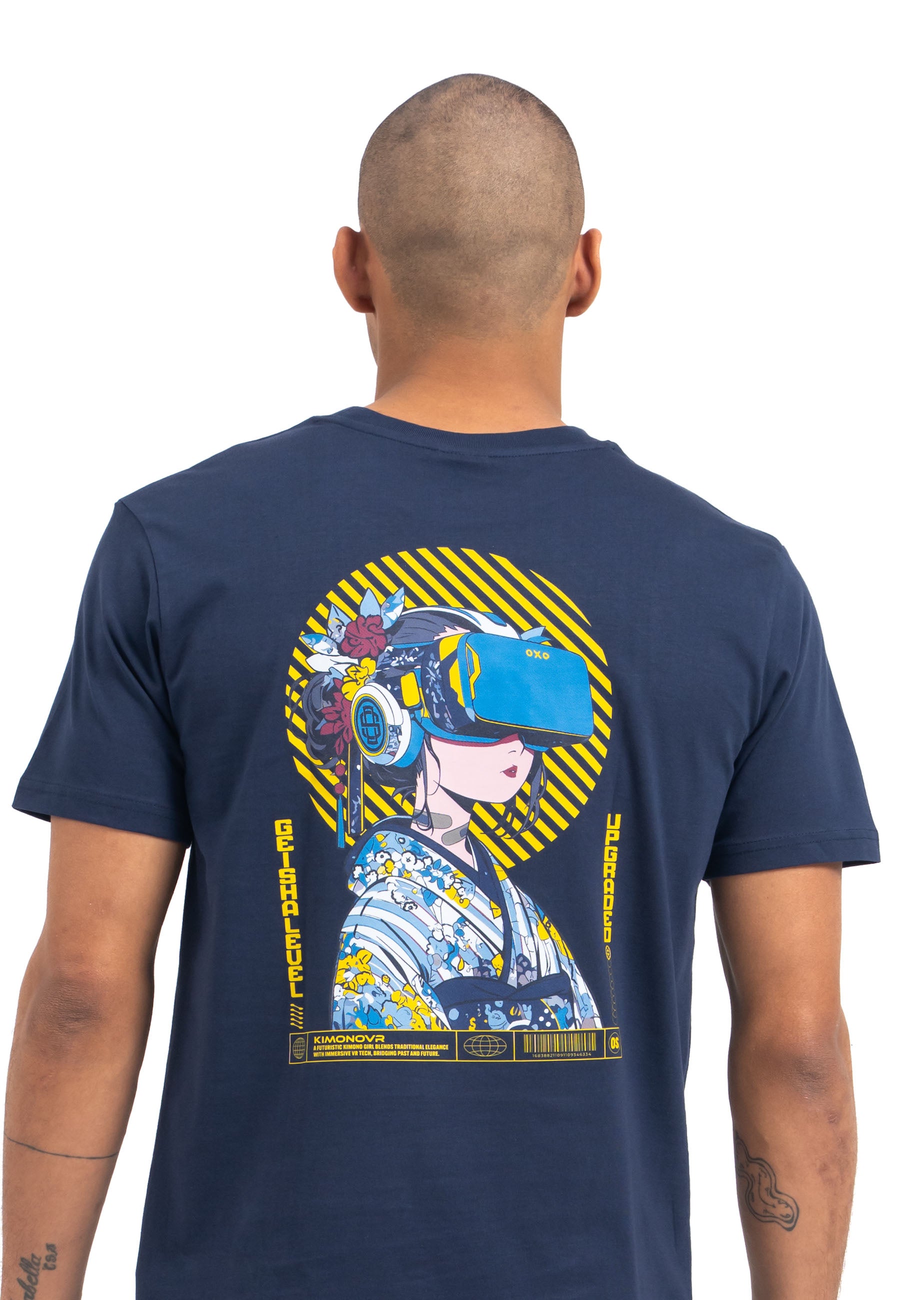 Print: Japanische Geisha mit VR-Brille in knalligen Farben mit kleinem Logoprint auf der Vorderseite