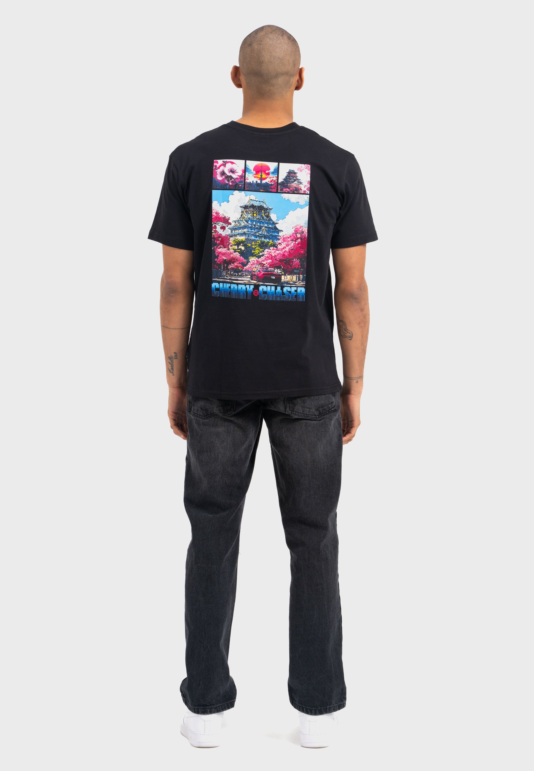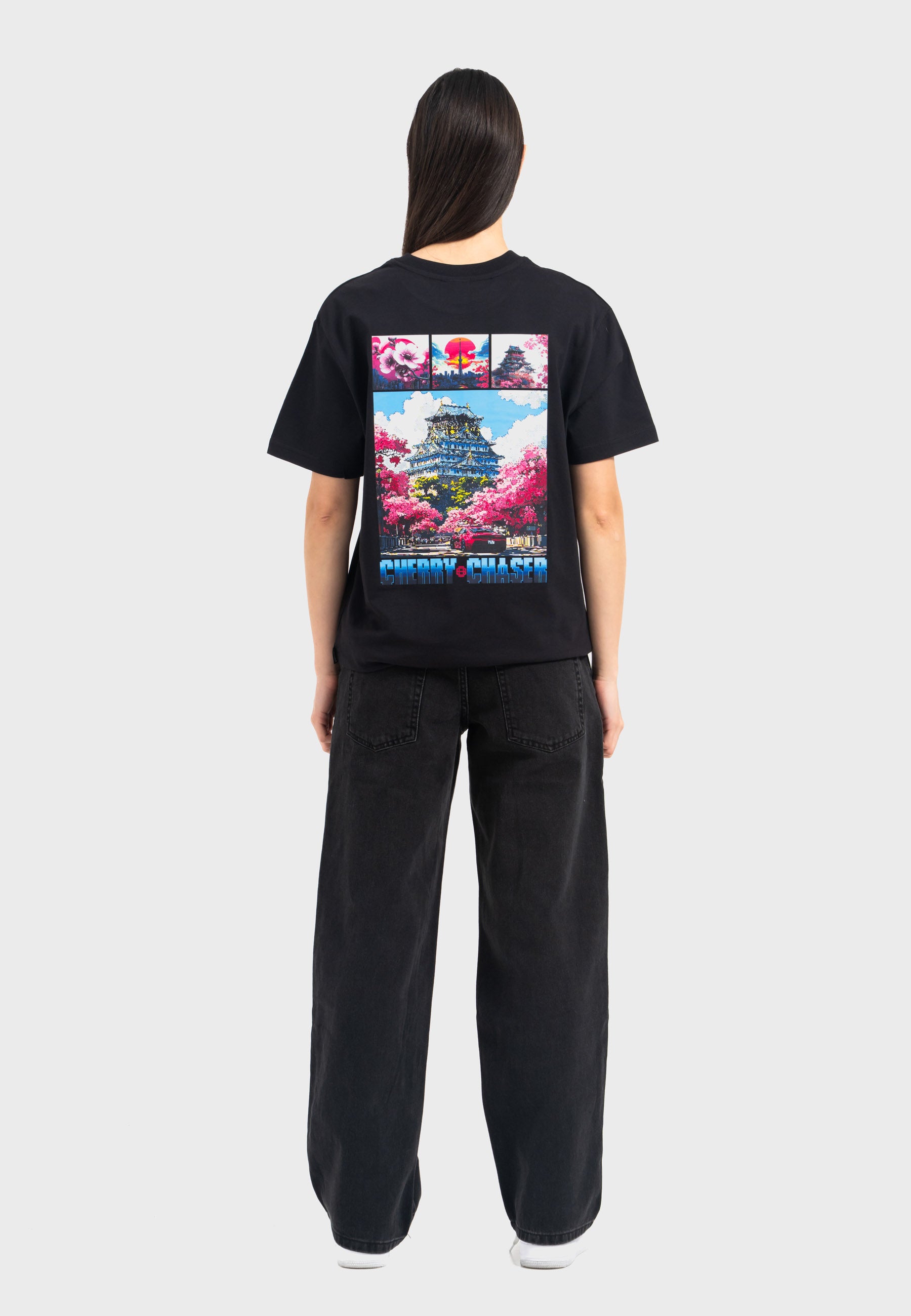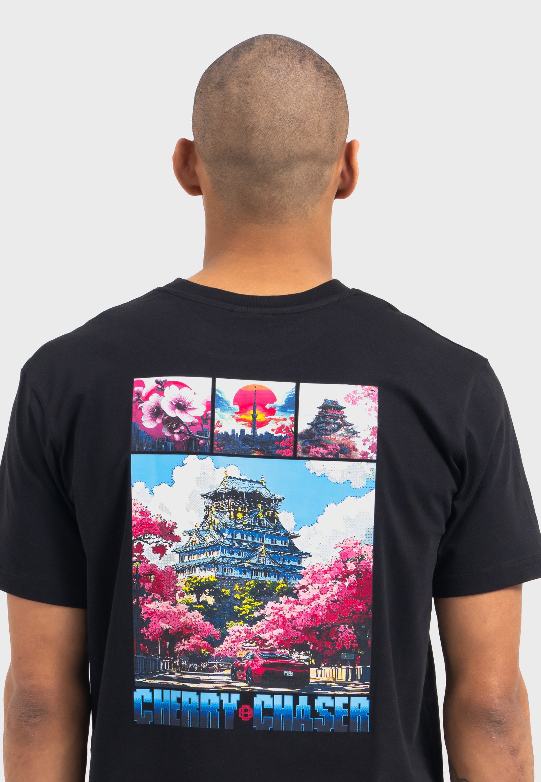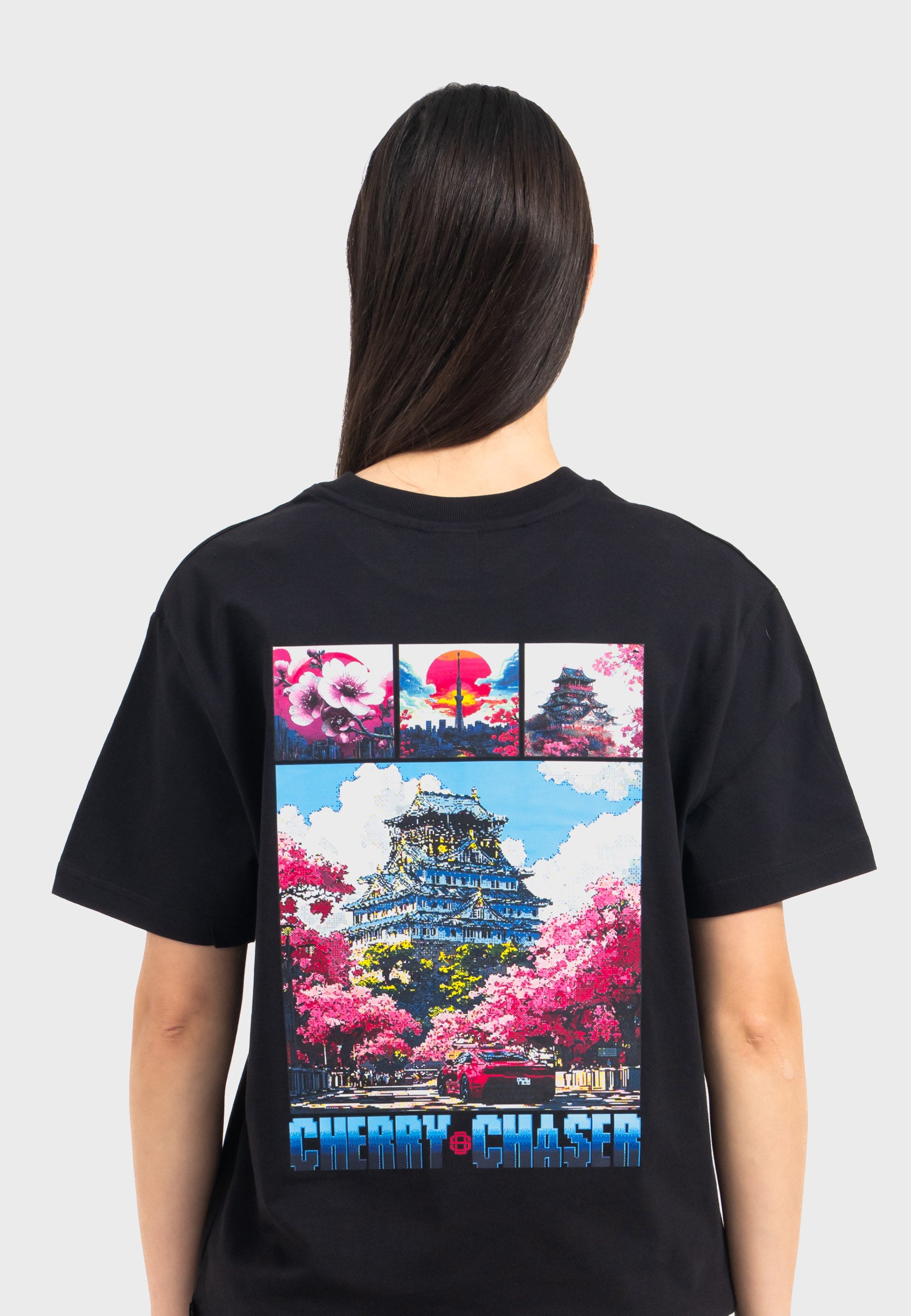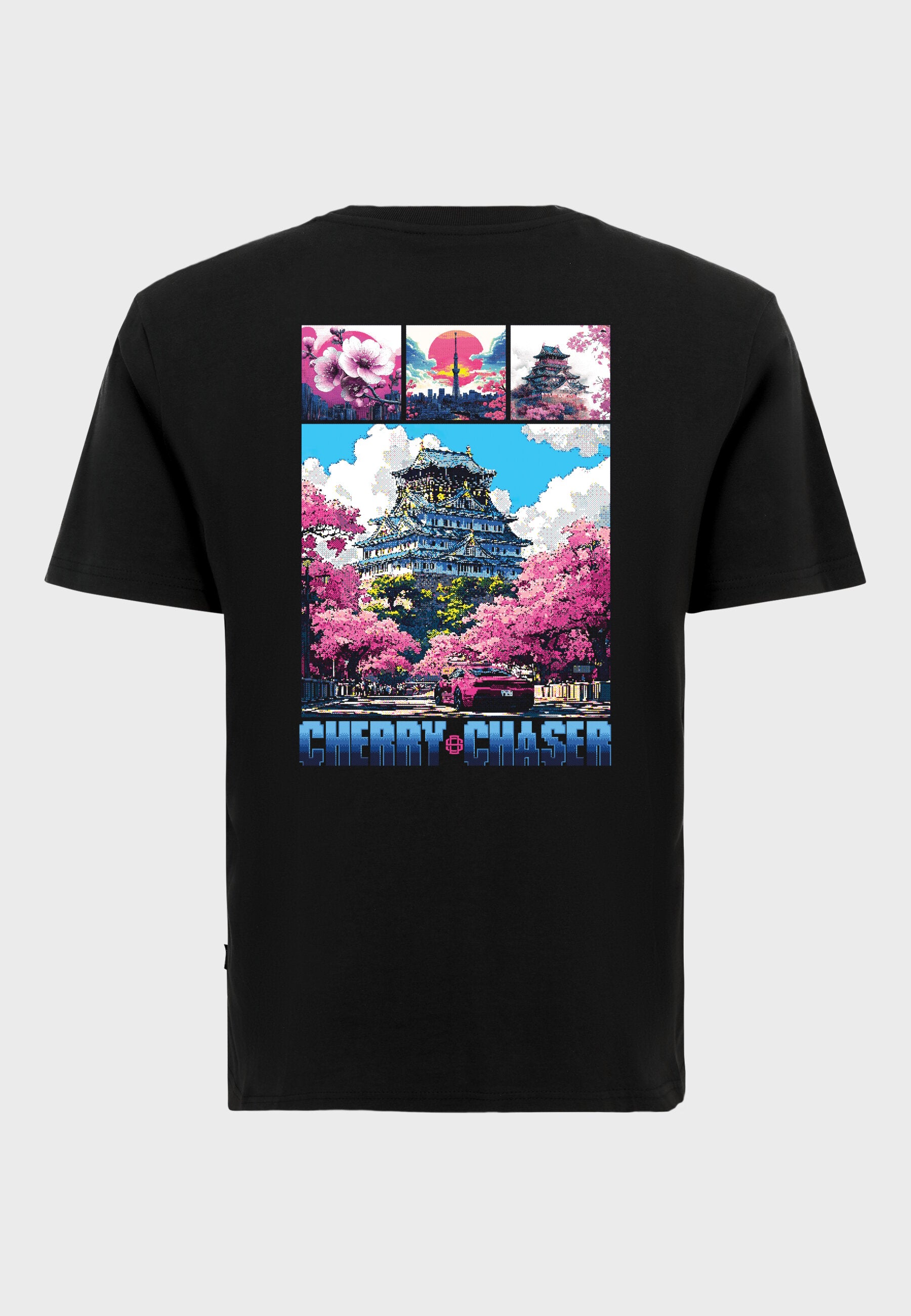Print: Japanese scenery during cherry blossom season in pixel art design with "Cherry Chaser" lettering and small logo print on the front